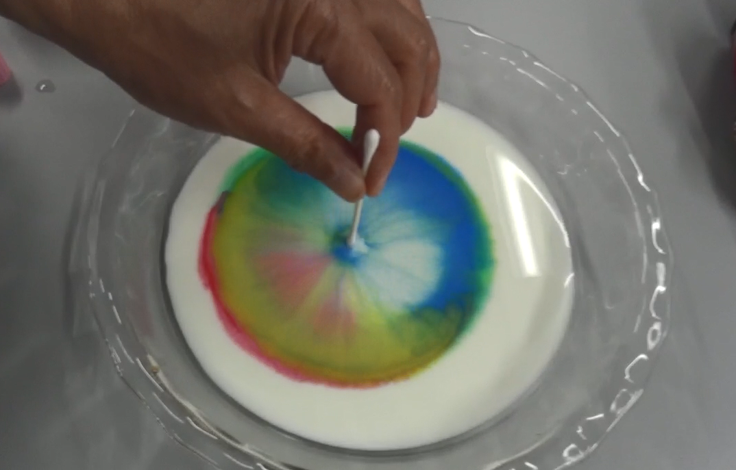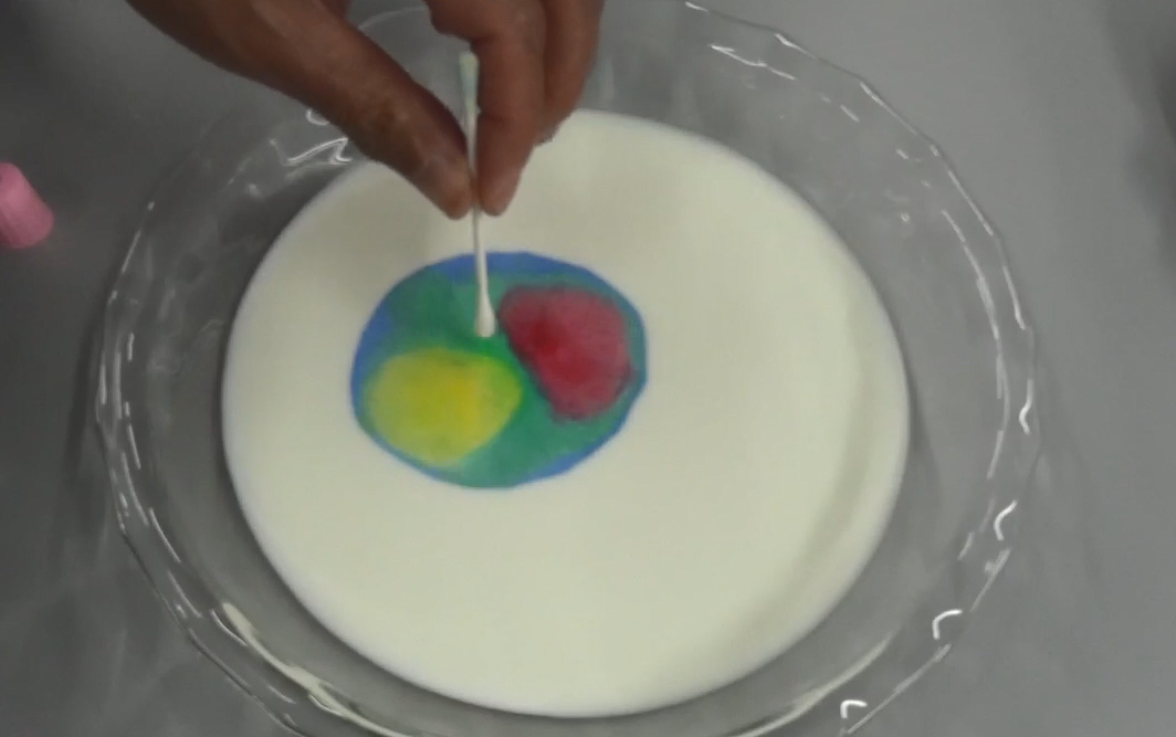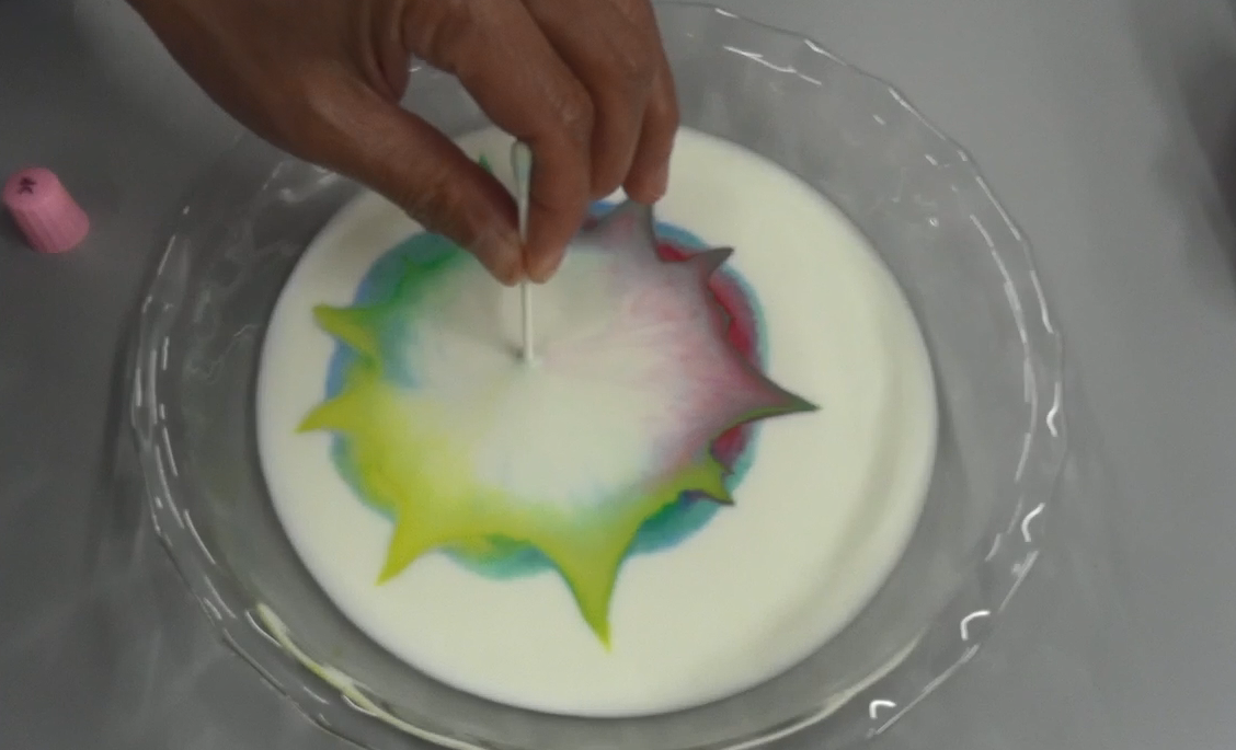 水の性質を利用し、牛乳と絵の具で水面に花火のような模様ができる様子を動画で紹介しました。