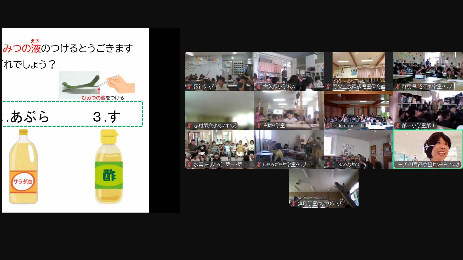 葉っぱで作った舟の実験動画を流しながら説明、合間にクイズを出すと元気いっぱいに手を挙げてくれました。