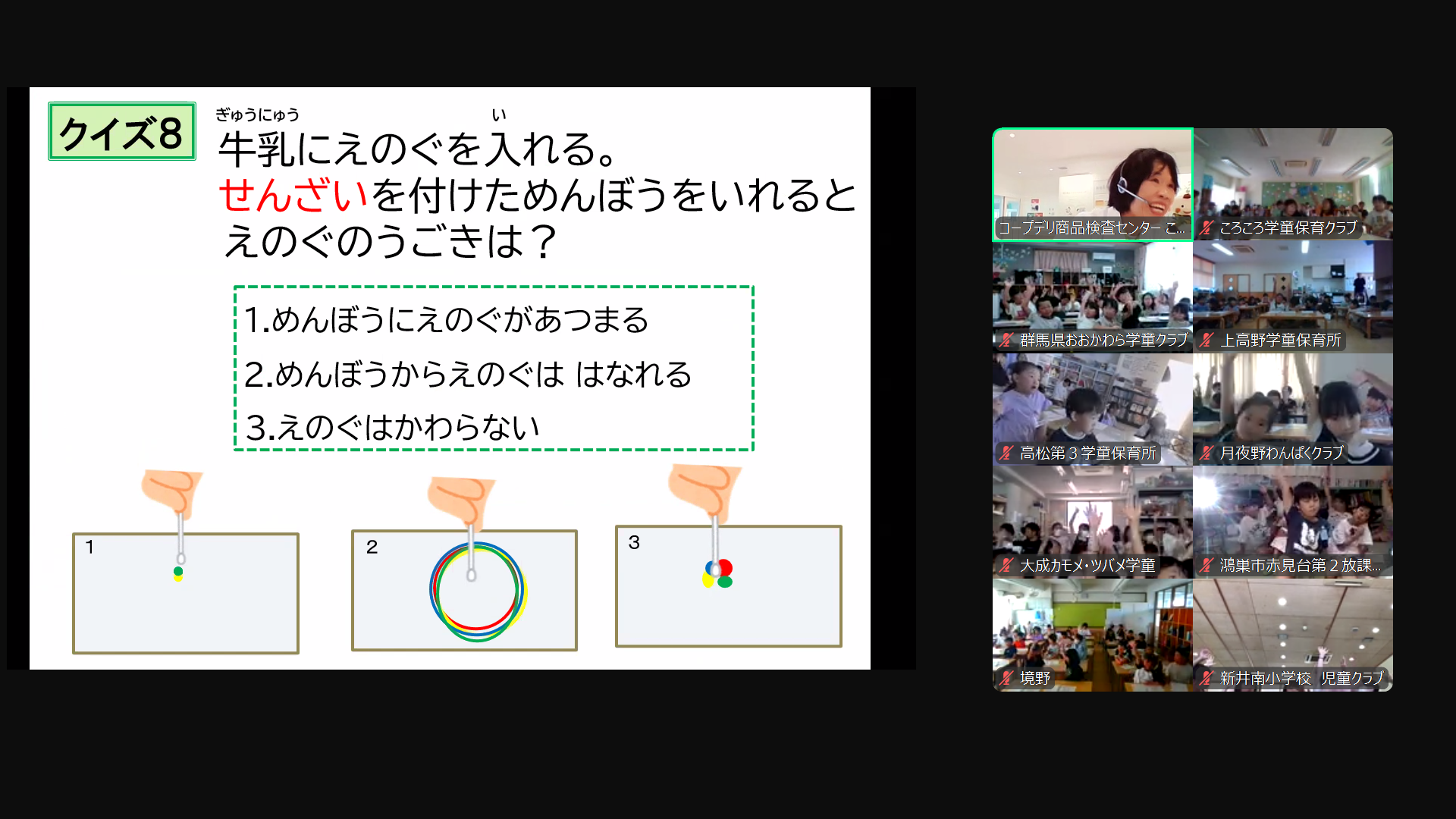 この学童限定企画は、コープデリ宅配で商品をお届けしている学童を対象にしたオンライン企画です。今回のテーマは「水のふしぎな力」ということで、表面張力について、クイズや実験動画を交えながら楽しく学んでもらうプログラムになっています。